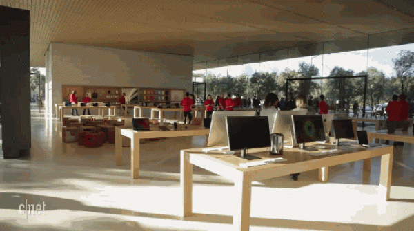 访客中心四面为坚固的玻璃墙,四角为弧形,位于Apple Park中心位置,外观与一般苹果实体店类似,其中一面墙上有一块巨大的屏幕展示苹果产品。在访客中心南部是一间有许多座位的室内咖啡厅。(来自:腾讯数码)