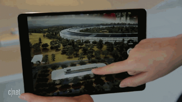 AR展示基于Apple Park简易模型展开,工作人员会交给游客一个装有特别应用的iPad,游客用iPad向着模型拍摄时,就会在屏幕上看到指定的建筑。