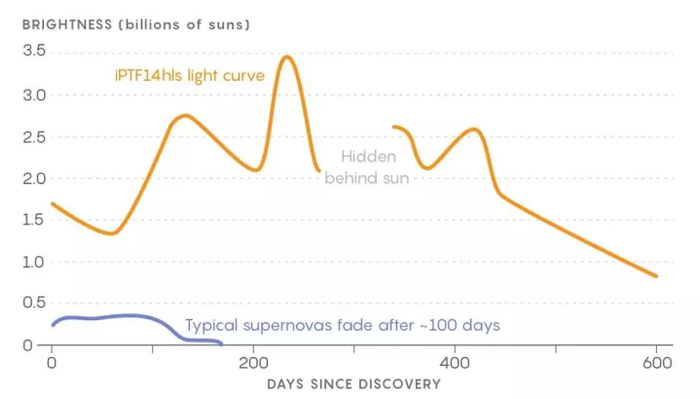 科学家理所当然地认为它将一去不复返,然而当9月来临时,iPTF14hls又一次从太阳后面转了出来,闪烁依旧。事实上,它的亮度比以前又升高了。