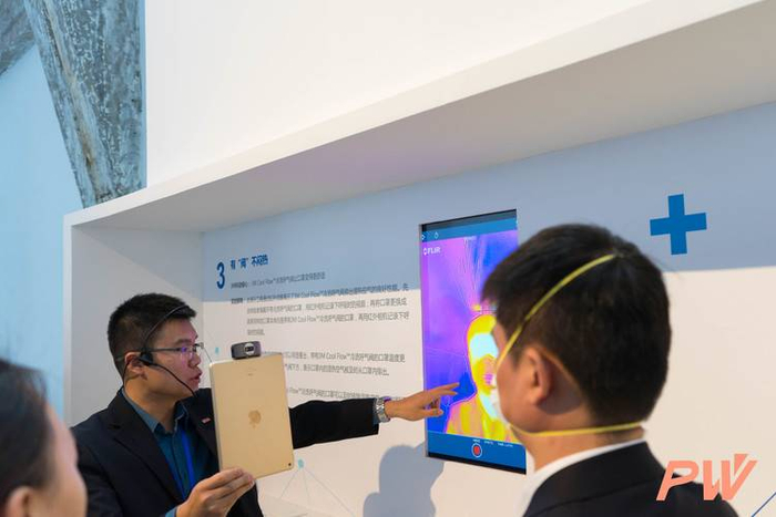 这也是 3M 口罩全产品线大部分都有那个标志性呼吸阀的原因之一:口罩内的湿热空气能及时排出。3M 工作人员通过红外热成像演示了冷流呼吸阀的实际效果——高温区域(深红色)集中在呼吸阀下方。
