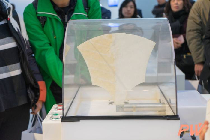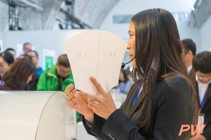 3M 工作人员现场演示了有静电和无静电滤棉的过滤效率——用一把「滤棉扇」扇动实验罩里的污染空气,「滤棉扇」分为左侧静电、右侧无静电。