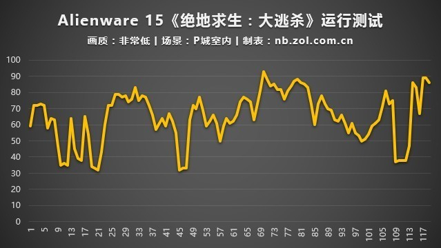 室外场景我们同样采用最低画质进行测试。Alienware 15在室外场景能够提供最低43fps,以及最高126fps流畅度,平均帧数能保持在87fps左右,相对于GTX 1060独显来说,能够提供更为流畅的体验。