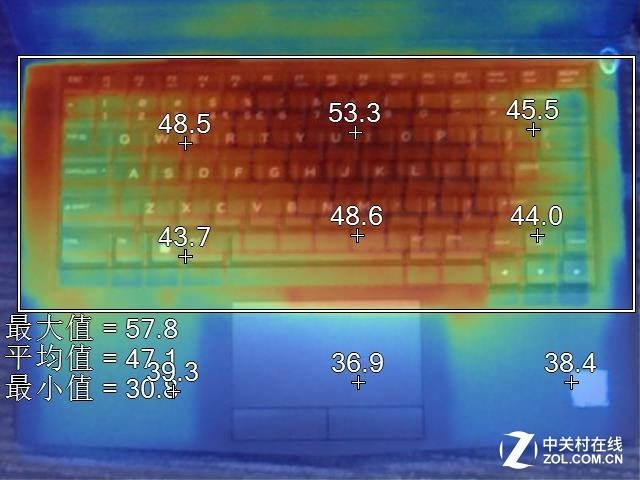 最后我们来看看Alienware 13在运行《绝地求生》时的键盘区域温度表现。通过热成像仪可以看到,键盘区域最高温度为57.8℃、平均为47.1℃,与玩家手部接触较为频繁的键位,如WASD、C、B、F区域,温度基本在43.7℃到48.5℃,手部整体感觉微热,但比较舒适,散热表现还是相当不错的。