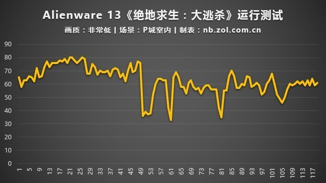 室外场景更是需要大家把画质调低,以便发现远处的敌人。Alienware 13在室外场景能够提供最低41fps,以及最高86fps流畅度,且整体波动平稳,基本在60fps以上,这对于玩家来说无疑会有最佳的体验。