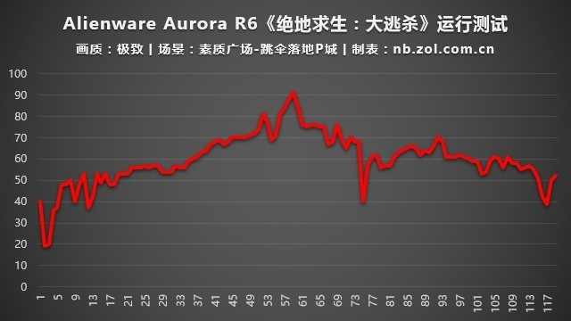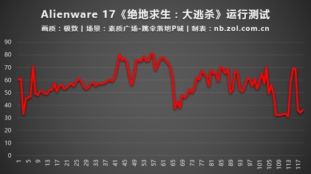 首先还是来看从素质广场到跳伞再到落地P城这一段测试,在极致画质下,最低帧数为31fps,最高帧数为81fps,整体波动幅度较大。素质广场区域帧数依然较低,跳伞到落地阶段平均帧数在57fps左右,整体表现流畅。