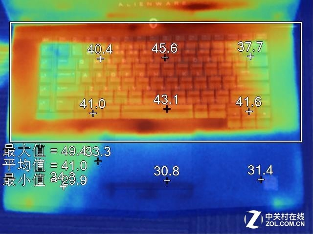 最后我们看看Alienware 15的键盘区域温度情况。最大温度为49.4℃,平均温度为41℃,可见机身尺寸大了之后,对于散热确实有更为明显的提升。同时,与玩家经常接触的按键区域,基本也都在40℃到45℃之间,整体感觉非常舒适。