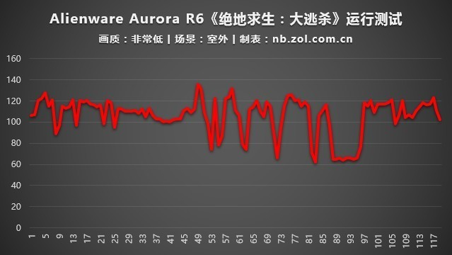 室内搜索过程当中,最低帧数为56fps,最高为136fps,整体帧数虽然波动比较明显,不过平均帧数达到96fps,非常流畅。从这一点就可以看出,桌面级平台玩《绝地求生》的话会有更好的流畅度表现。
