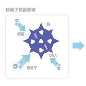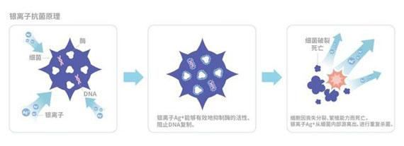 银离子,化学符号Ag+,是一种无机抗菌物质,靠库仑引力牢固吸附于细胞膜上并击穿细胞壁进入细胞内使细胞蛋白质凝固,细胞就会因丧失分裂增殖能力而死亡。此外,银离子Ag+也能破坏微生物电子传输系统、呼吸系统、物质传输系统,当菌体失去活性后,银离子Ag+又从菌体中游离出来,重复杀菌,因此其抗菌效果持久。银离子的杀菌能力强,每一升水中只要含亿万分之二毫克的银离子,即可杀死水中的大部分细菌。尤其是六边形纳米银粒子比球形和三角形纳米银粒子具有更强的抗菌性能。此外,银离子无机抗菌物质,相比市面上较多的有机化合抗菌物质,在对抗多重耐药菌方面具有明显优势。