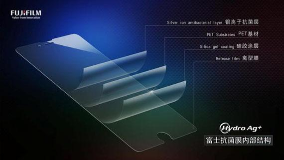 1996年日本病原性大肠感菌感染事件,引起日本全国范围内对抗菌材料研制开发的极大重视,也是目前日本在这一领域处于领先地位的重要原因。富士Hydro Ag⁺银离子抗菌保护膜采用日本全进口材料,由银离子Ag⁺抗菌层、PET基层、硅胶涂层、离型膜四层组成,但厚度仅为0.158毫米(移除离型膜后),且充分发挥了富士胶片卓越的光学制膜技术,该膜的PET基层轻薄、透光性好,能防眩光、防反射,极大提升了观看液晶屏幕的眼睛舒适度;其3H硬度、安全防爆,耐磨抗划伤的能力也能更好地保护手机屏幕;表面经过超亲水涂层技术处理,可减少油污和指纹,保持画面的显示完美;独特的三段式离型膜设计,应用自主吸附式硅胶层,使气泡容易消除,用户自行贴膜非常简单方便。