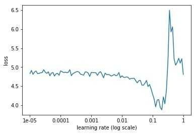 这个方法在论文中是用来估计网络允许的最小学习率和最大学习率,我们也可以用来找我们的最优初始学习率,方法非常简单。首先我们设置一个非常小的初始学习率,比如1e-5,然后在每个batch之后都更新网络,同时增加学习率,统计每个batch计算出的loss。最后我们可以描绘出学习的变化曲线和loss的变化曲线,从中就能够发现最好的学习率。