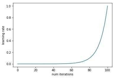 breakplt.figure()plt.xticks(np.log([1e-5, 1e-4, 1e-3, 1e-2, 1e-1, 1]), (1e-5, 1e-4, 1e-3, 1e-2, 1e-1, 1))plt.xlabel('learning rate')plt.ylabel('loss')plt.plot(np.log(lr), losses)plt.show()plt.figure()plt.xlabel('num iterations')plt.ylabel('learning rate')plt.plot(lr)