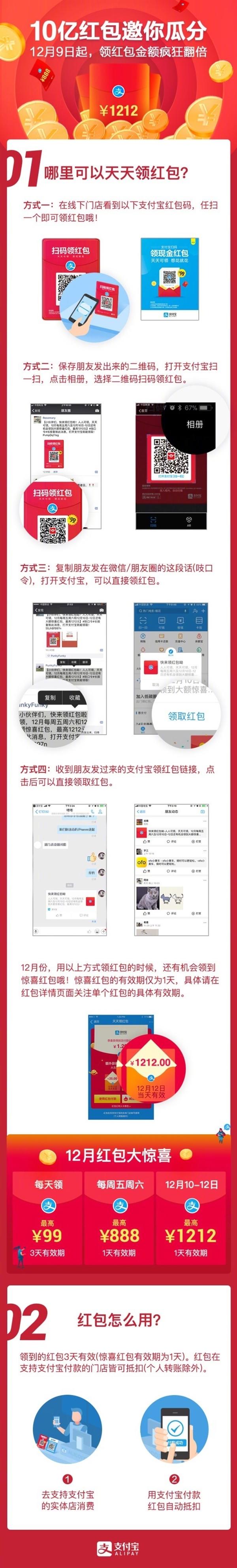 近日,支付宝宣布赚钱红包玩法升级,12月9日(今天起)有888元和1212元的惊喜红包。具体来说,每周五周六可领到最高888元的红包(1天有效期),12月10-12日,可领到最高1212元的红包(1天有效期)。