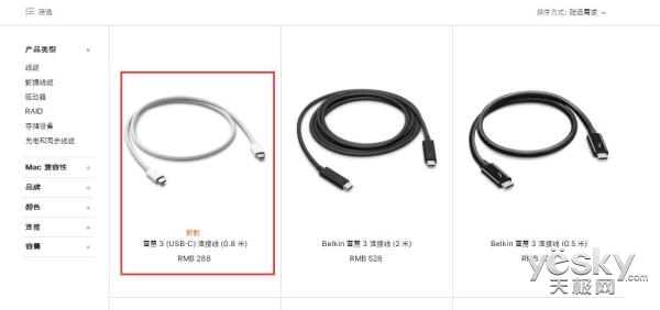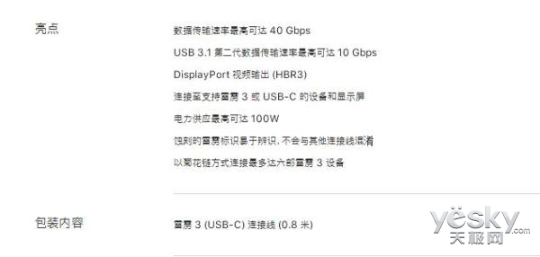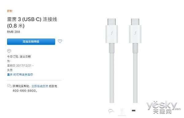 苹果首款Thunderbolt 3 USB-C数据线雷雳3开卖 288元