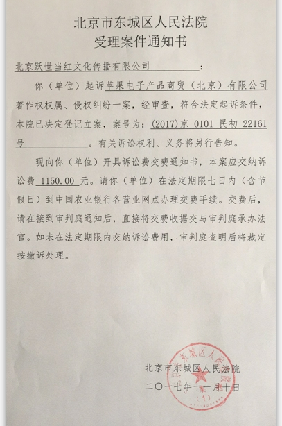 日前,北京市东城区人民法院正式受理一起国内企业针对苹果公司的起诉。北京跃世当红文化传播有限公司(KON品牌持有方)正式状告苹果电子产品商贸(北京)有限公司侵犯其美术作品著作权。