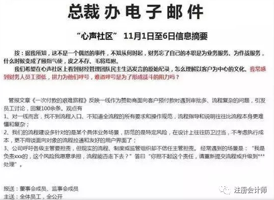 我们希望在心声社区上看到财经管理团队民主生活发言的原始纪录,怎么理解以客户为中心的文化。我常感到财务人员工资低,拼力为他们呼号,难道呼号是为了形成战斗的阻力吗?”