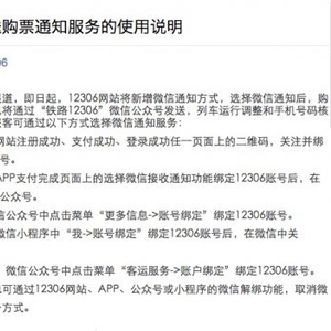 12306将新增微信通知方式 退改车票信息可由12306官微发送