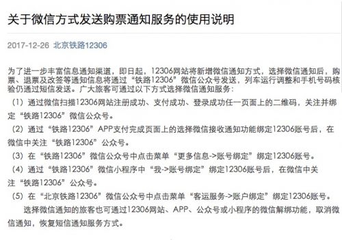 通知显示,选择微信通知的旅客也可通过 12306 网站、APP、公众号或小程序的微信解绑功能,取消微信通知,恢复短信通知服务方式。