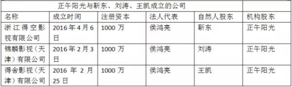 融资后的正午阳光,开始了全新的资本布局,2016年2月,正午阳光和刘涛合资成立了锦麟影视(天津)有限公司,同月,和王凯合资成立的得舍影视(天津)有限公司,4月和靳东合资成立浙江得空影视有限公司,且三家公司的法人均为侯鸿亮,注册资本均为1000万。