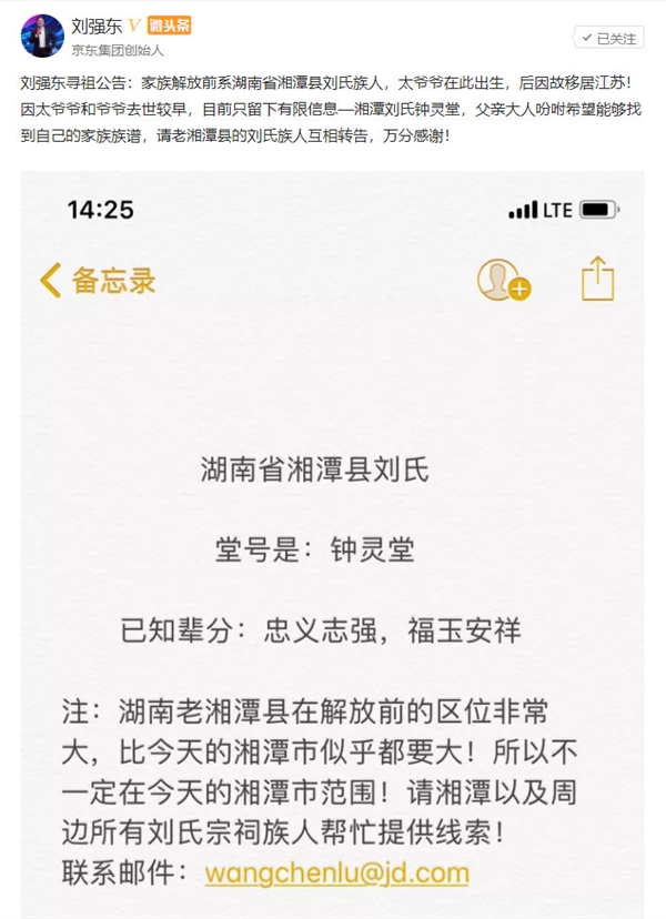 今天下午,刘强东在社交网络发布寻祖公告,希望找到自己的家族族谱。