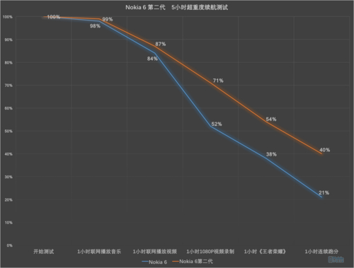 Nokia 6第二代的电池容量为3000mAh,和前作相同。可怕的是,在硬件性能获得了大幅提升的情况下,Nokia 6第二代续航能力不降反升,经过我们模拟一整天高强度使用的5小时超重度续航测试,剩余电量高达40%,几乎是一代Nokia 6(21%)的两倍。