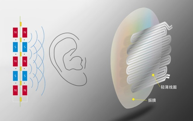 平板耳机原理简单来说是将线圈嵌入轻薄的振膜中,永磁体集中在振膜的一侧或两侧,振膜中线圈内变化的电流产生磁场,在永磁体的产生的磁场中受力被作用,从而震动发声。这样的设计需要注意的是线圈需要均匀分布在振膜上,使驱动力平均分布。