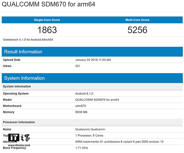 被测设备拥有6GB内存,并且搭载Android 8.1 Oreo系统,数据显示该处理器的四颗小核频率为1.71GHz,另外四颗大核的频率未知。该处理器的整体性能介于骁龙660和骁龙835之间,并且更接近后者,单核成绩为1863分,多核为5256分。据悉首款使用骁龙670的Android设备可能会在2018年年中发布,预计高通将在春季之前正式发布该芯片。