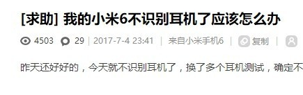 2.小米6经常无法识别自己的小米耳机,有的时候需要多次插拔的反复过程才可能恢复,而且,至于耳机什么时候可以恢复正常,这个完全就看运气了,在笔者的体验中,这个恢复过程可能需要10秒钟到1分钟,然后你才能用耳机听歌;