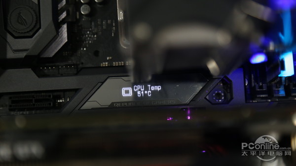 这次M10F和以往最大的不同是加入了一个能显示主板各部件包括CPU温度等状态的液晶显示屏,似乎自从七彩虹影驰等显卡厂商在显卡上加上液晶显示屏后,这东西就顺利接过RGB的棒子成为DIY厂商的新宠儿(xuetou),实测发现假如放进机箱,能见度一般。