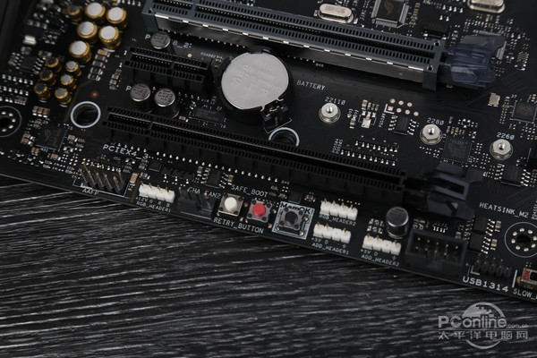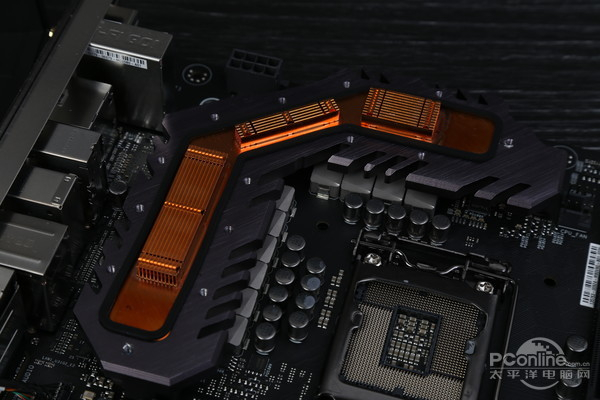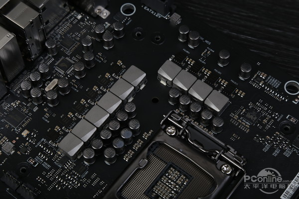 锯齿状的散热片下面覆盖的是豪华的6+4相CPU供电,其中6相是直接给CPU供电,4相是给核显供电,电容方面采用10K黑金电容,寿命是普通电容5倍左右。