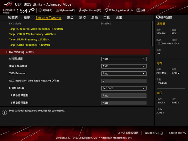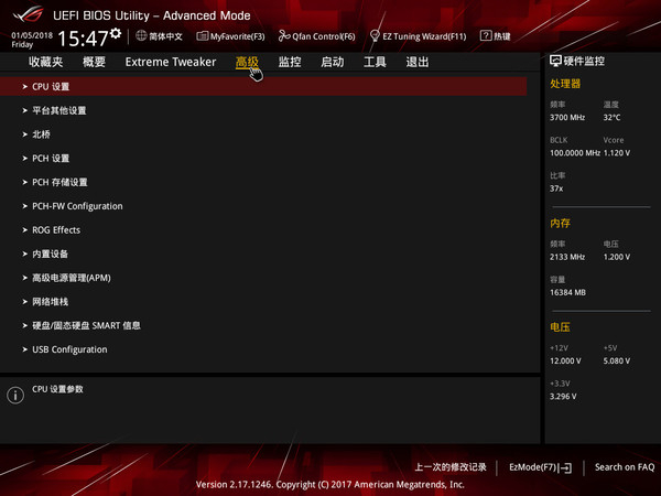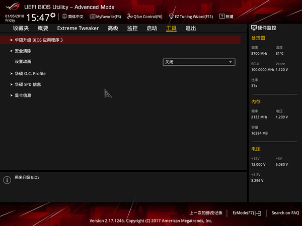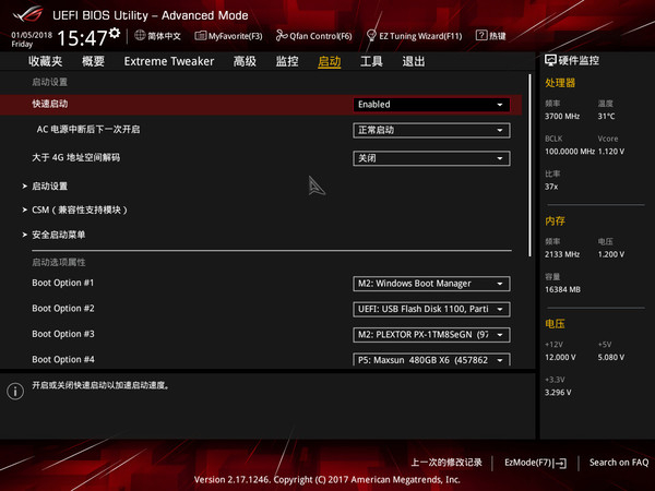 华硕的BIOS还是一如既往的简单明了,语言切换成中文后基本就知道怎么使用了