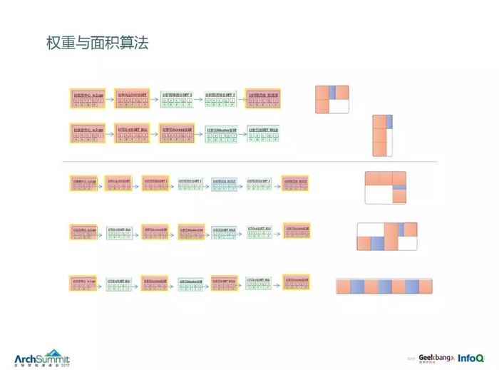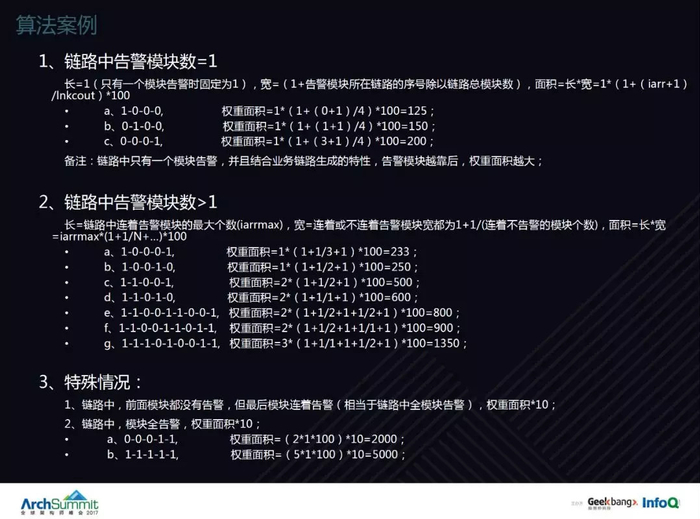 后面是简单的一个算法,这种链路怎么去判断权重,哪个应该告警,哪个应该不告警,这里有个简单的面积算法。简单解释一下,根据告警连续,如果一连续它的长度就加,如果不连续它的纵向就减,最后算出一个简单的面积来。