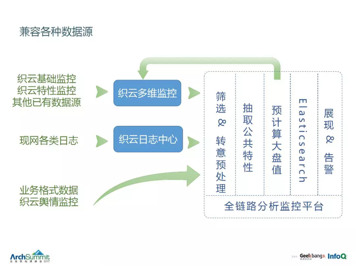 我们会把基础监控、特性监控,现网的各种日志,各大系统中的文本类数据等灌到我们的日志中心里去。经过一系列的筛选,提取一些特征,计算一些中间值,形成全连路数据。现在我们也用到一些很多的一些开源组件比如 Elasticsearch 再做一些展现,然后全链路监控平台大概的结构就是这个样子,最终我们希望能够帮助用户去做很多分析。