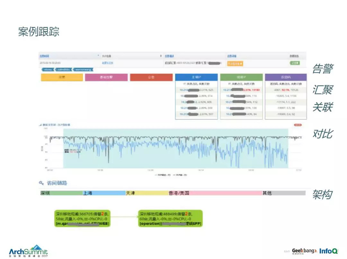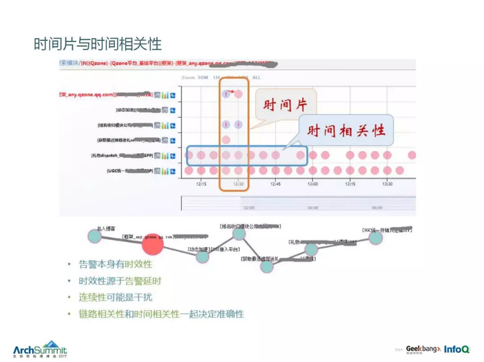 举例说,用户 QQ 里面不能发消息了,往往不一定是 QQ 有问题,很有可能后面数据库宕掉了。在一个多运维团队协同分工运营体系下,前端负责人很多时候不知道后面那台数据库宕掉了,所以现象和结果往往是关联不起来的,我们这个方法是希望能够做到这一点。