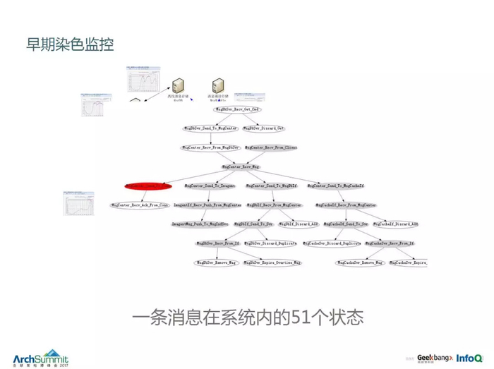 要举个例子大家才能理解什么叫全链路,这个图是 QQ 业务的一个局部服务的架构图,标记 QQ 里面好朋友见发消息的时序,消息在整个腾讯的体系里会经过 51 个步骤,这里面任何一个地方出问题了,都可能会造成丢消息。过去为了监控丢消息这个情况,整个系统中的这 51 个状态点都会去埋点,就是做染色,故障发生时可以很快知道消息到底在 51 个系统中的哪个地方丢掉的,这就是早期的染色监控方式。但随着时间服务架构越来越复杂,产品越来越多,这种方式已经很难推行,特别是站在运维的角度,希望通过这种方式去完成各种业务架构的监控,做不到了,因此“织云全链路监控方式”就诞生了。