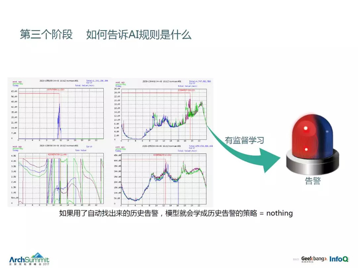 第三个部分是告诉 AI 规则是什么,通过一些有监督学习的方式,让机器首先去做一些粗判,人工去做一些监督,训练机器,对曲线的形态有准确的判断,对我们的告警检测会相当有帮助。(201712 月最新的进展已经在织云 AIOps 里面落地,请参考最新分享)