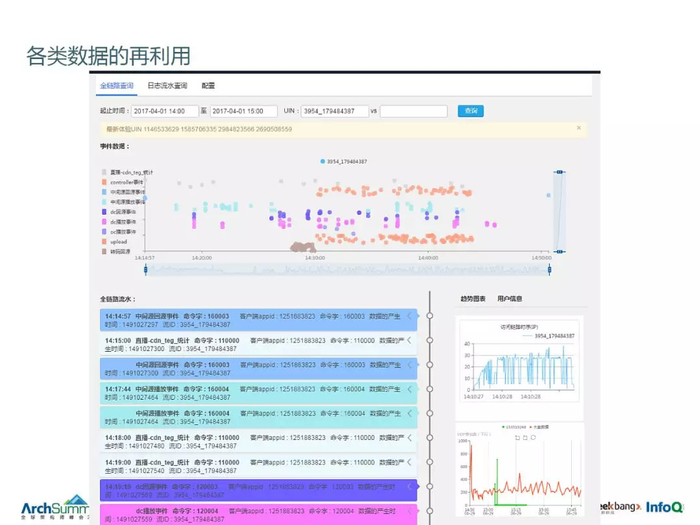 这个事情一开始做的时候觉得也挺困难的,各种各样的日志格式也不一样,数据形式也不同,甚至都有怀疑说这个方式做不做的下去,但是发现不断深入去做,这里面发掘出来的一些有价值的数据反倒是越来越多,举个例子,原来我们都说用户直播的时候卡顿,我们也不知道是为什么,但现在好了,只要这个用户一上来,通过所有的数据汇聚就可以知道他用的什么机型,我们还会收集用户的 CPU,CPU 一直是 100%,很有可能这个机器不是特别高效,比如说它的网络,有的可能在用 3G 玩直播,可能在一些特殊的场景下,比如电梯里面。