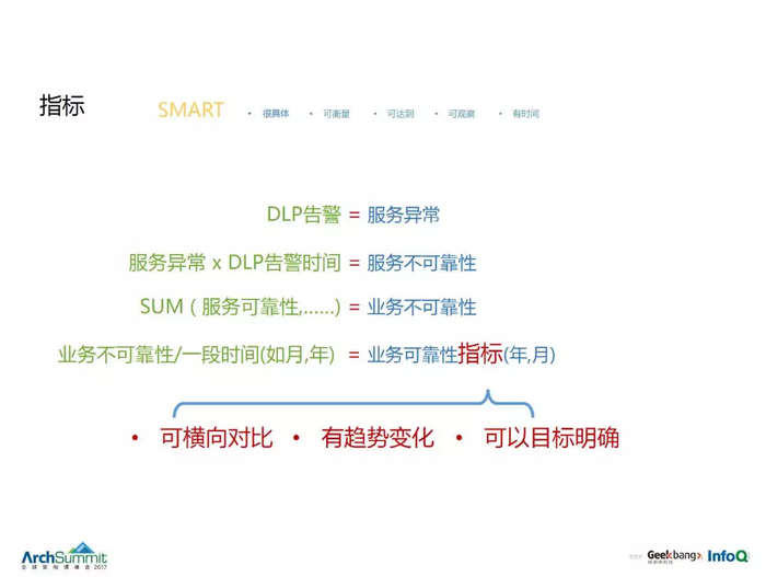第一,这套告警体系里面是不允许有阀值这个概念的,比如说你告诉我告警超过三次,你就要告警,No,在我们这里面是不允许,比如说业务访问量正常情况下大概每天 1000 万量,跌下来了,比如跌到 800 万,你就得有告警,No,在我们这里也不支持。在我们这里面不允许用阀值,在我们这里面只有一个指标,就是成功率。