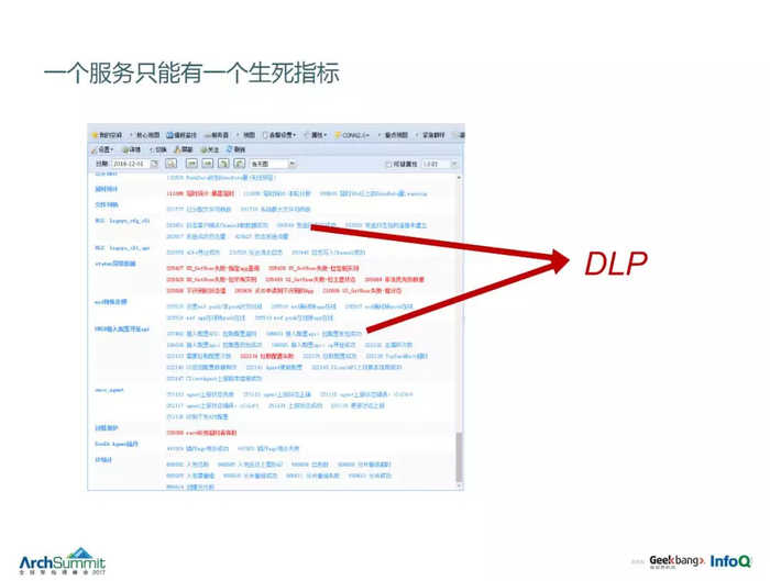 上面截图中的每一段文字就是一个监控点,而此截图仅仅来自一个服务。仅仅织云 monitor 监控就有 125 万个指标。这就是为什么我们的告警会有那么多的原因了。所以我们会从这些监控服务中抽出一些关键的指标生成 DLP。