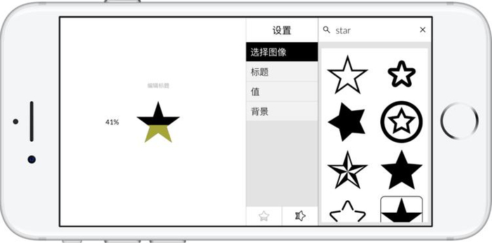 最后一个水位图比较特殊,即以地球、星星、水杯等图标为载体,度量两个元素占比的区域图。滑动图表中间的分割线就可以控制两种颜色在图表中的占比,具体的百分比显示在图表右方。在编辑页面右下角的设置板块里,你可以搜索不同的图形(目前只能输入英文),设置标题名称、组图背景等。