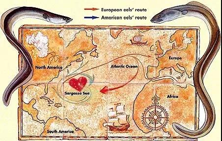 虽然欧洲鳗和美洲鳗外形相似,但在形态学上却分属不同的种,它们或许会在藻海相遇,但一定只是遥遥相望,然后各自洗洗睡了。它们只会与同种交配,出生后的小鳗鱼也是向左走和向右走,各自踏上漫长的成长之路,等它们长大,也会像它们的父母一样遨游万里回到自己的出生地,鳗鱼为何会选择如此遥远的繁殖地,至今仍然是个谜。