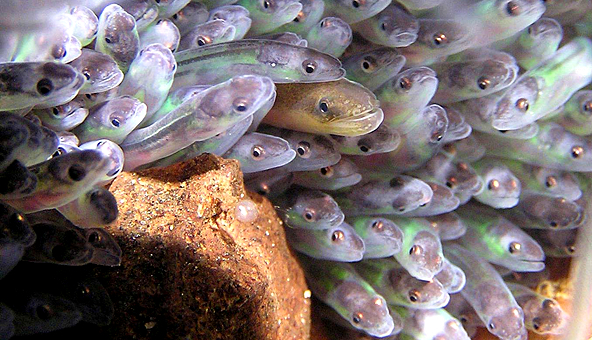日本鳗幼苗在河流里自然生长的存活率本就不高,河流污染和筑坝让它们的处境更加恶化,所以今天绝大多数的日本鳗出自人工养殖场。然而这些养殖场,其实都是有“养”而无“殖”:渔民每年十二月到三月用灯光引诱来到近岸的玻璃鳗,把它们捞起来放入养殖场,养大之后再送上餐桌。而这些鳗鲡当然也永远无法回到它们的家乡繁殖下一代。