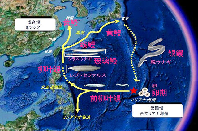 日本科学家自上世纪三十年代起开始寻找日本鳗的出生地,科学家们从日本近海逆着黑潮一路往南追寻,鳗鱼幼苗的体型越采越小,经过了半个世纪的努力,东京大学海洋研究所研究船“白凤丸”在马里亚纳海沟西侧采集到1000多尾10mm长孵化不久的鳗鱼苗,经过仔细的DNA比对,最终在1991年确定了日本鳗产卵场的大致范围。