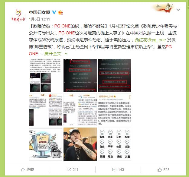 《中国妇女报》发文也称PG ONE的锅嘻哈不背(图片来源:中国妇女报微博)
