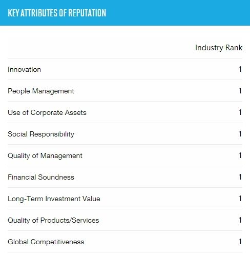 值得一提的是,苹果在所有声誉排名关键指标中全部排名第一,包括创新、员工管理、企业资产使用、社会责任、管理层水平、财务稳健性、长期投资价值、产品&服务的品质以及全球竞争力。