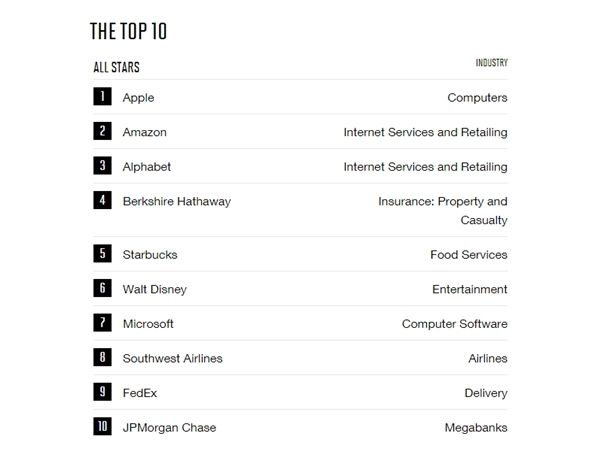 据榜单显示,苹果公司、亚马逊公司领先谷歌母公司Alphabet,分别位居第一名、第二名和第三名,其次是巴菲特旗下的伯克希尔-哈撒韦公司和全球咖啡连锁企业星巴克也进入了Top 5。