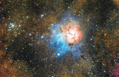 | M20三叶星云,摄影器材为星特朗RASA摄星镜、QHY247C相机、艾顿CEM60赤道仪、宇隆L-pro滤镜,单张曝光10分钟,累计曝光8小时。吴振 胡伟熙摄 |