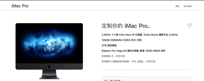 iMac Pro 是苹果历史上性能最强大的 Mac 电脑 ,专门为需要进行视频和照片编辑、虚拟现实内容创作和实时 3D 等专业用户设计。iMac Pro 可以选配 18核英特尔至强处理器,4TB SSD,128GB ECC 内存,AMD Radeon Pro Vega 64显卡。