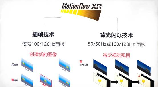 目前解决电视动态画面存在的拖影等问题主要依靠插帧技术,索尼电视的Motionflow功能中还加入了背光闪烁技术。所谓背光闪烁,即通过背光源不断开关来消除视觉残留。