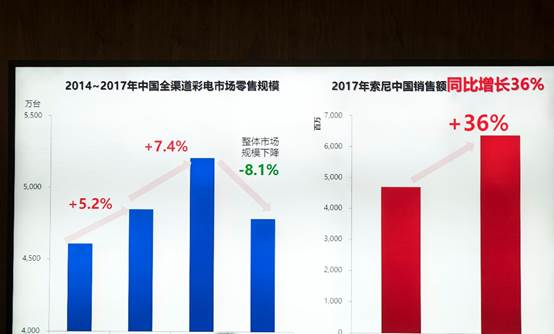 过去的2017年,受上游面板涨价影响,中国乃至全球彩电市场规模下降,其中中国市场降幅高达8.1%。但是对走高端路线的索尼电视而言,同比销售额却逆势大涨36%。