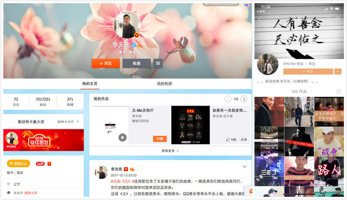 回溯天佑的成名经历,可以算是一个底层人物翻身的样板。早年间,天佑翻唱的《众人饮酒醉》在网络上爆红,还引来众多明星的喊麦挑战。随着越来越多人的关注,天佑的人气也迅速飙升。在快手和YY等直播平台集聚了大量粉丝,更被称为是“快手一哥”。与此同时,天佑的广告费也达到千万级别,各种王牌网综也上了一遍,人气似乎不输一线明星。